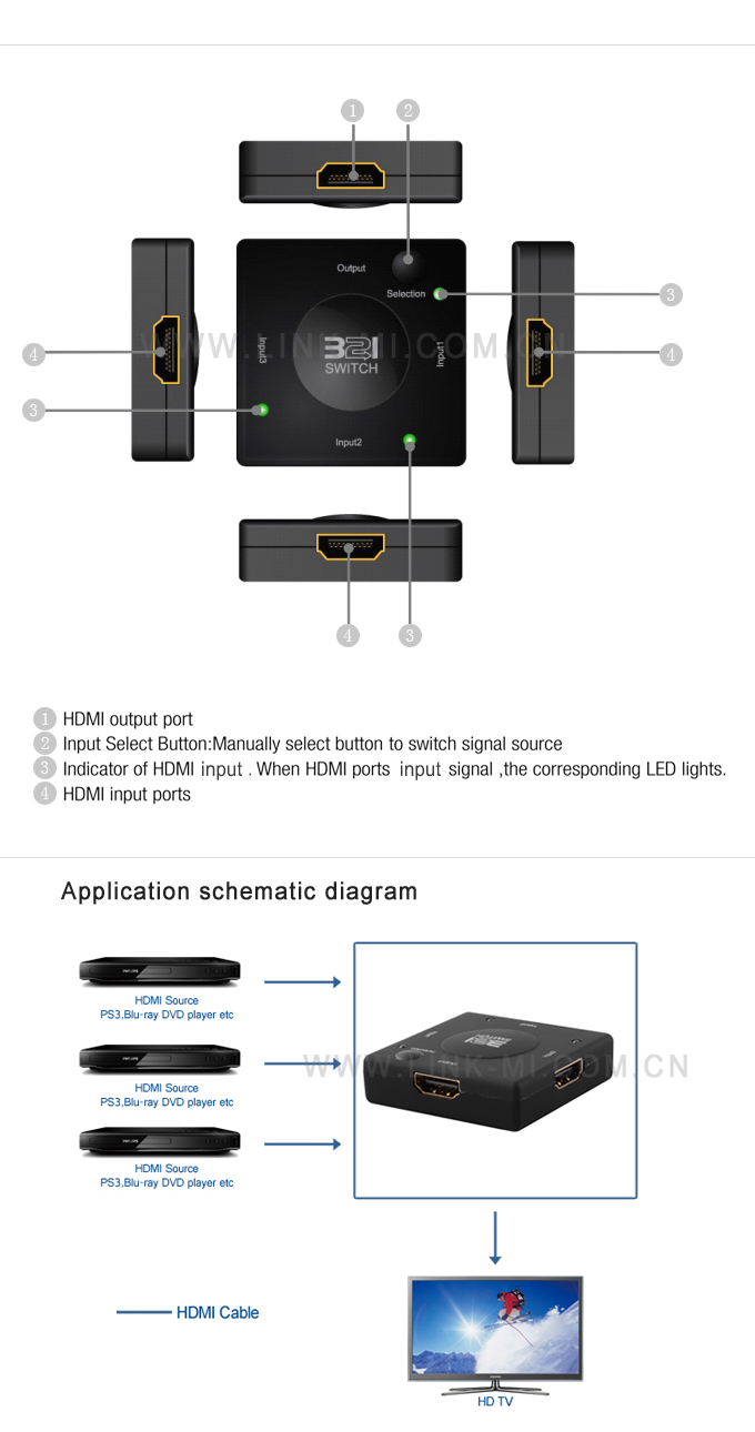 1) 3 HDMI inputs,1 HDMI output2) Compact size3) Supports data rates up to 2.7Gbps4) Supports deep color display.5) Supports Resolution up to1080p6) No need DC power7) Easy to install and operate. |