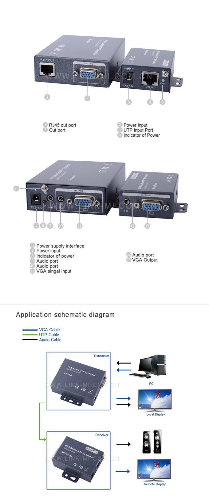 1) Video quality adjustment for different lengths of CAT5/5e/6 cable is done manually for the video-only extender, and automatically for audio/video extender.